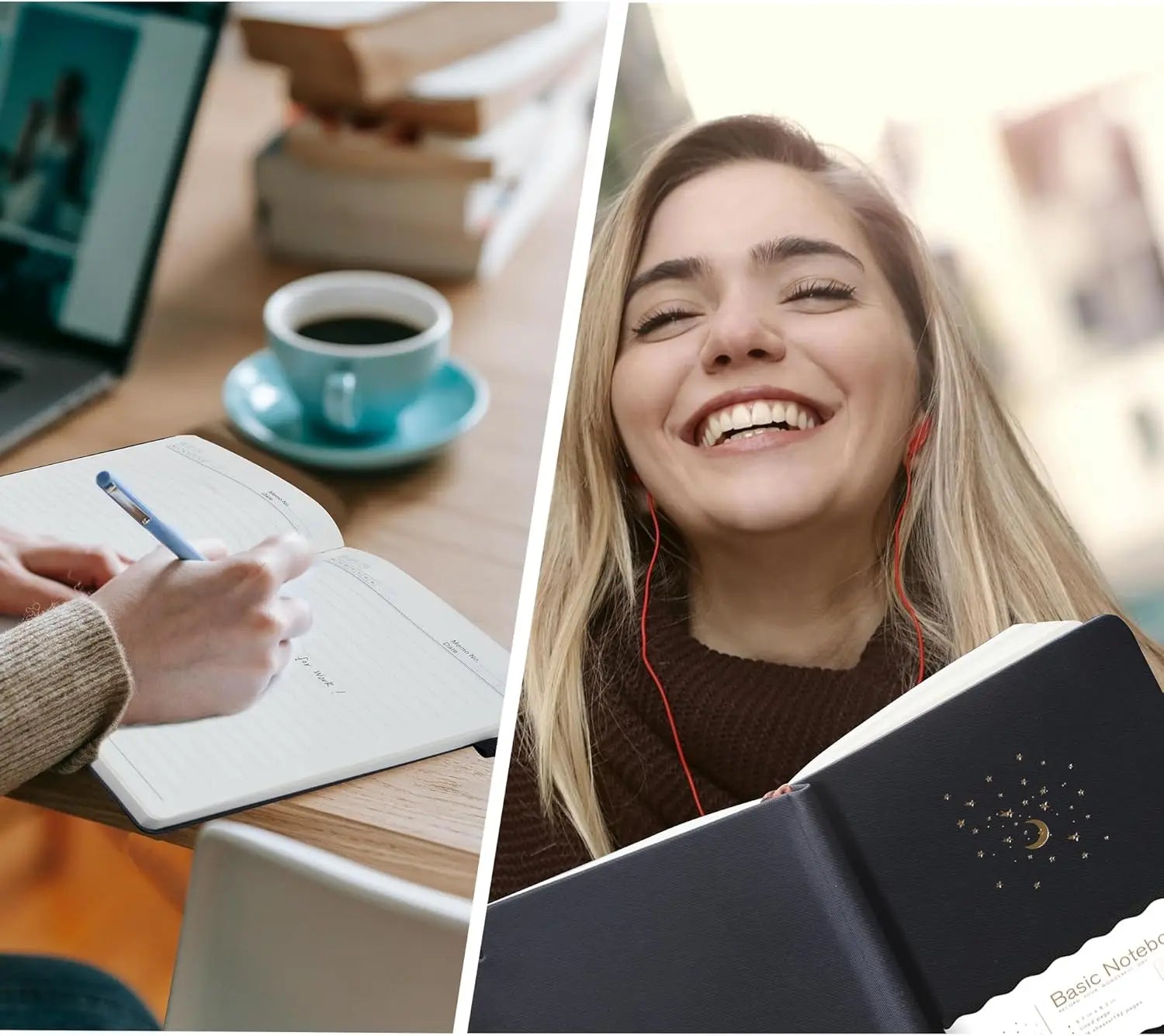 Discover our premium hardcover lined journal notebook, designed to enhance your writing and note-taking experience. Ideal for work, school, or personal use, this notebook combines durability with elegant features. Key Features: - **Durable Hardcover**: Made with a sturdy hard cover that protects your notes and ensures long-lasting use. The cloth cover adds a touch of elegance and resists wear over time. - **High-Quality Paper**: Includes 196 pages of non-white paper with 8mm wide ruled lines to protect your eyesight and provide a comfortable writing surface. The rounded corners prevent hand injuries during extended use. - **Lay-Flat Design**: Engineered to lay flat when open, making it easy to write on every page without the hassle of holding it down. This design improves reading ease and note-taking efficiency. - **Convenient Accessories**: Features an elastic closure band to keep the notebook securely closed, a satin ribbon bookmark for quick page marking, and a built-in pen loop for storing your pen conveniently. - **Elegant Aesthetic**: Adorned with a beautiful gold foiling pattern of moons, stars, and meteors on the cover, adding a decorative touch to any desk or workspace. Perfect as a gift for women or men who appreciate stylish stationery. - **Versatile Use**: Suitable as a travel journal, meeting notebook, teen diary, or college class notes. The small icons on each page help organize entries efficiently for diaries or meeting minutes. - **Reliable Binding**: Sturdy binding ensures pages stay intact without risk of falling apart, providing peace of mind during daily use. Why Choose This Notebook? This hardcover journal is crafted from premium materials to offer both functionality and style. It's an excellent choice for anyone seeking a reliable notebook for writing creativity or professional note-taking. With its thoughtful design elements like the elastic band and pen loop, it keeps everything organized and accessible. Satisfaction Guarantee: We stand by the quality of our products. If you're not completely satisfied due to any issues with the notebook's quality upon receipt (e.g., defects in materials or construction), we offer replacement options or refunds as needed—no questions asked.