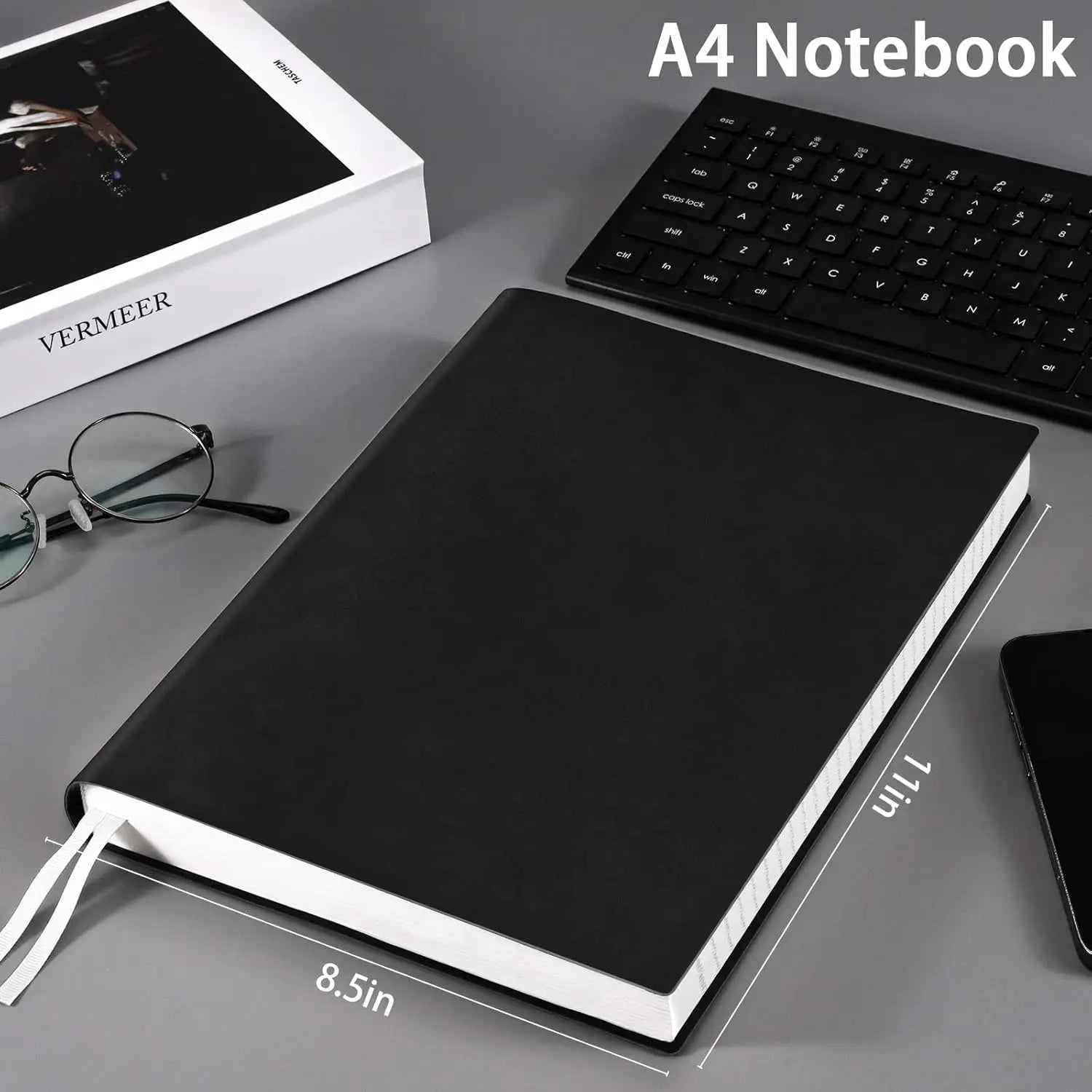 Discover our premium leather journal notebook, designed to enhance your writing and organization experience. This versatile notebook is perfect for various uses, from professional work to academic studies. Key Features: - **Durable Leather Cover**: Made from high-quality leather that offers a classic look and long-lasting protection for your notes. The black finish adds a sleek, professional touch suitable for any setting. - **Large A4 Size (8.5 x 11 inches)**: Provides ample space for writing, sketching, or planning. Its standard size makes it easy to carry in bags or use on desks without taking up too much room. - **400 Pages of College-Ruled Paper**: Each page features college-ruled lines to help keep your writing neat and organized. The thick paper minimizes bleed-through from pens or markers, ensuring clean pages throughout. - **Includes 125 Sticky Tabs**: Comes with a set of 125 sticky tabs in various colors, allowing you to easily categorize sections, mark important pages, or create custom indexes for quick reference. - **Convenient Inner Pocket**: An inner pocket is located at the back of the journal, perfect for storing loose papers, receipts, photos, or other small items securely without them getting lost. - **Versatile Use Cases**: Ideal for students taking notes in class, professionals organizing meetings and projects at work, writers journaling ideas, or anyone needing a reliable notebook for daily tasks. It serves as an excellent gift option due to its practical design and aesthetic appeal. - **High-Quality Construction**: Bound with sturdy stitching to ensure durability even with frequent use. The pages lay flat when open for comfortable writing on both sides without straining the spine. This leather journal combines functionality with style, making it a must-have accessory for anyone who values organization and creativity in their daily life. Whether you're jotting down thoughts at home or managing tasks in the office school environment.